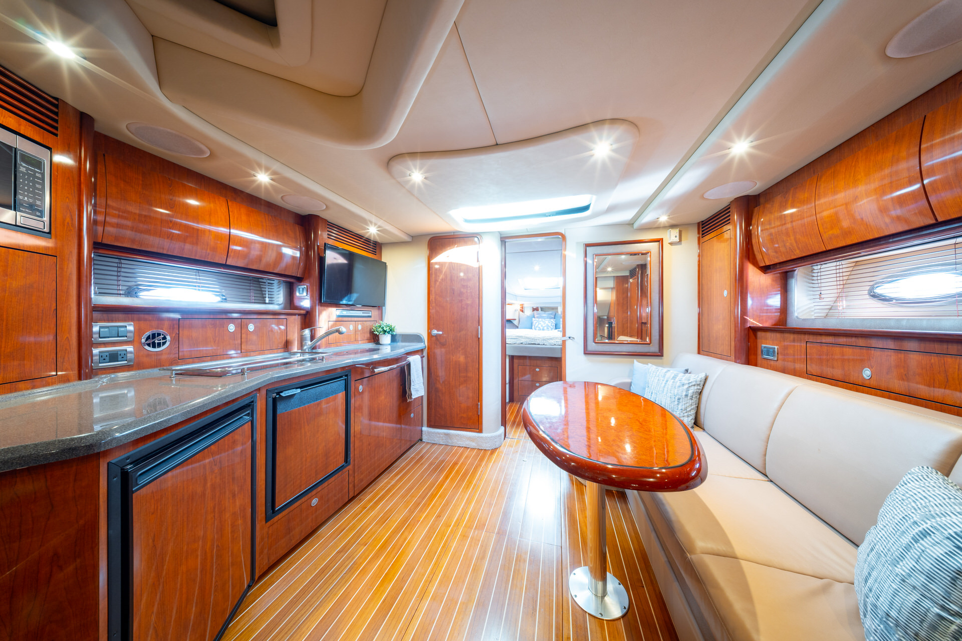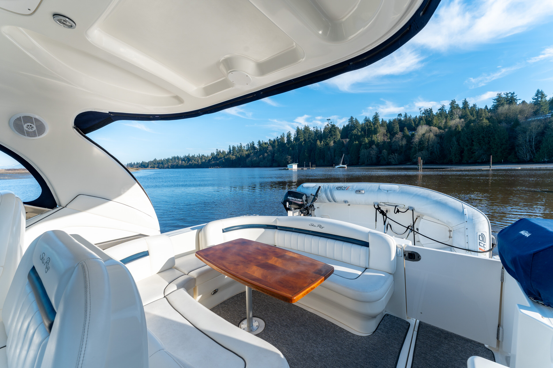 Exceptional cruiser powered by twin MerCruiser 8.1S engines with 900 hours. With strong performance and an excellent family layout, this Sea Ray 390 offers spacious accommodations (including private master with access to enclosed head), updated canvas, bow thruster, and SeaWise davit system. The sitting room aft can be converted to a private stateroom with a convertible bed, and a hideaway pocket door for privacy. The vessel has the valuable opportunity for a new owner to assume its slip at Crescent Beach Marina upon approval.
